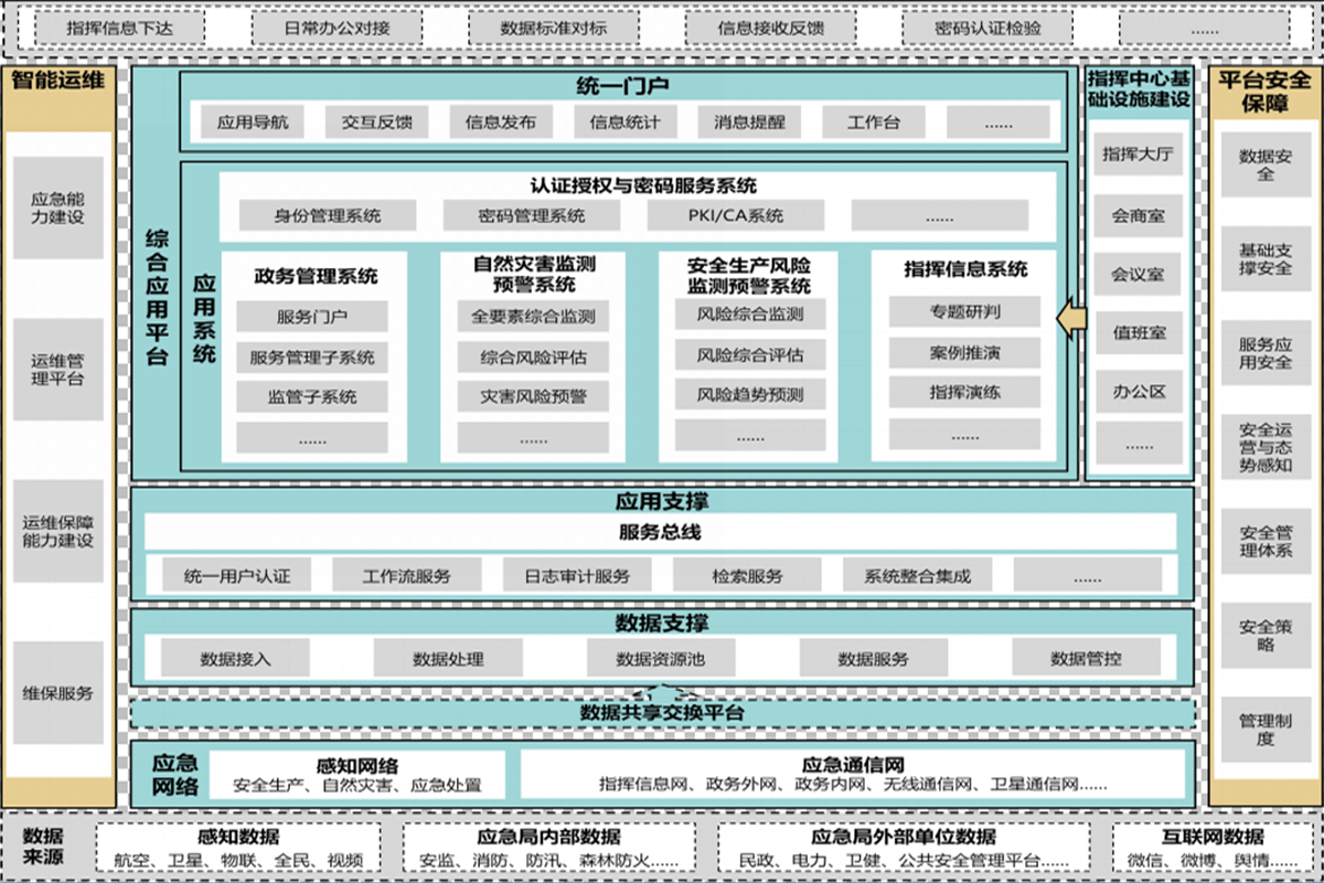 建设内容包括:感知网络、、指挥信息网、、、卫星通信网、、、综合应用平台、、、数据治理系统、、、应用支撑与系统集成、、、自然灾害综合监测预警系统、、、安全生产风险监测预警系统、、政务管理应用系统、、、、指挥信息系统、、认证授权与密码服务